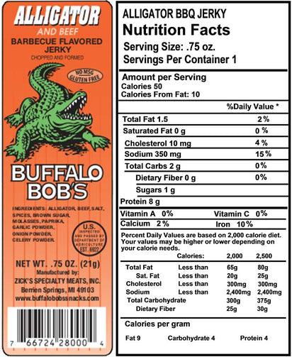 Ingedients Alligator, Beef, Salt, Sugar, Spices, Red Pepper, Onion, Sugar, Garlic, Celery Powder