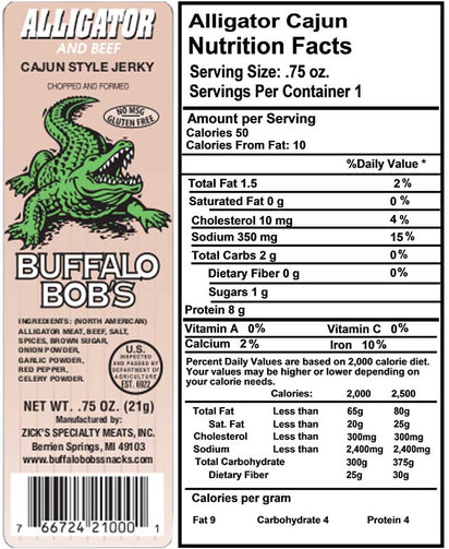 Ingredients: Alligator, Beef, Salt, Sugar, Spices, Red Pepper, Onion, Sugar, Garlic, Celery Powder